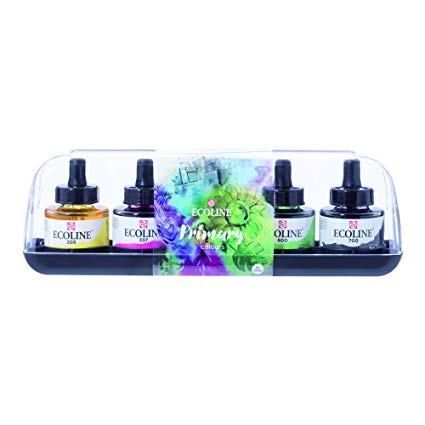 Gli acquerelli liquidi Ecoline della Talens sono colori intensi e trasparenti pronti all'uso le cui tinte molto vive sono da sempre apprezzate in svariati campi artistici come il disegno architettonico, l'illustrazione, il design di moda, ecc. Possono essere stesi a pennello, con penne a china o aerografo proprio per la loro caratterisca solubilità. Da utilizzare su supporti specifici per acquerello