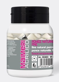 pasta densa semitrasparente di colore grigiastro che consente di ottenere particolari effetti materici sabbiosi simili all'intonaco grezzo. conferisce una finitura opaca, un aspetto ruvido. molto elastica non crepa durante l'essiccazione.consente di ottenere alti spessori modellabili con un peso relativamente basso. si miscela con colori acrilici, tempere, acquerelli. si usa pura e si dipinge dopo l'essiccazione. forma una superficie porosa molto ricettiva. essiccazione direttamente proporzionale allo spessore utilizzato. aderisce su tutte le superfici. permette di inglobare materiali diversi nell'opera. il colore naturale spegne la vivacità dei colori a cui è miscelata. contiene: resina acrilica in emulsione acquosa, pomice di lipari, agenti addensanti e stabilizzanti.